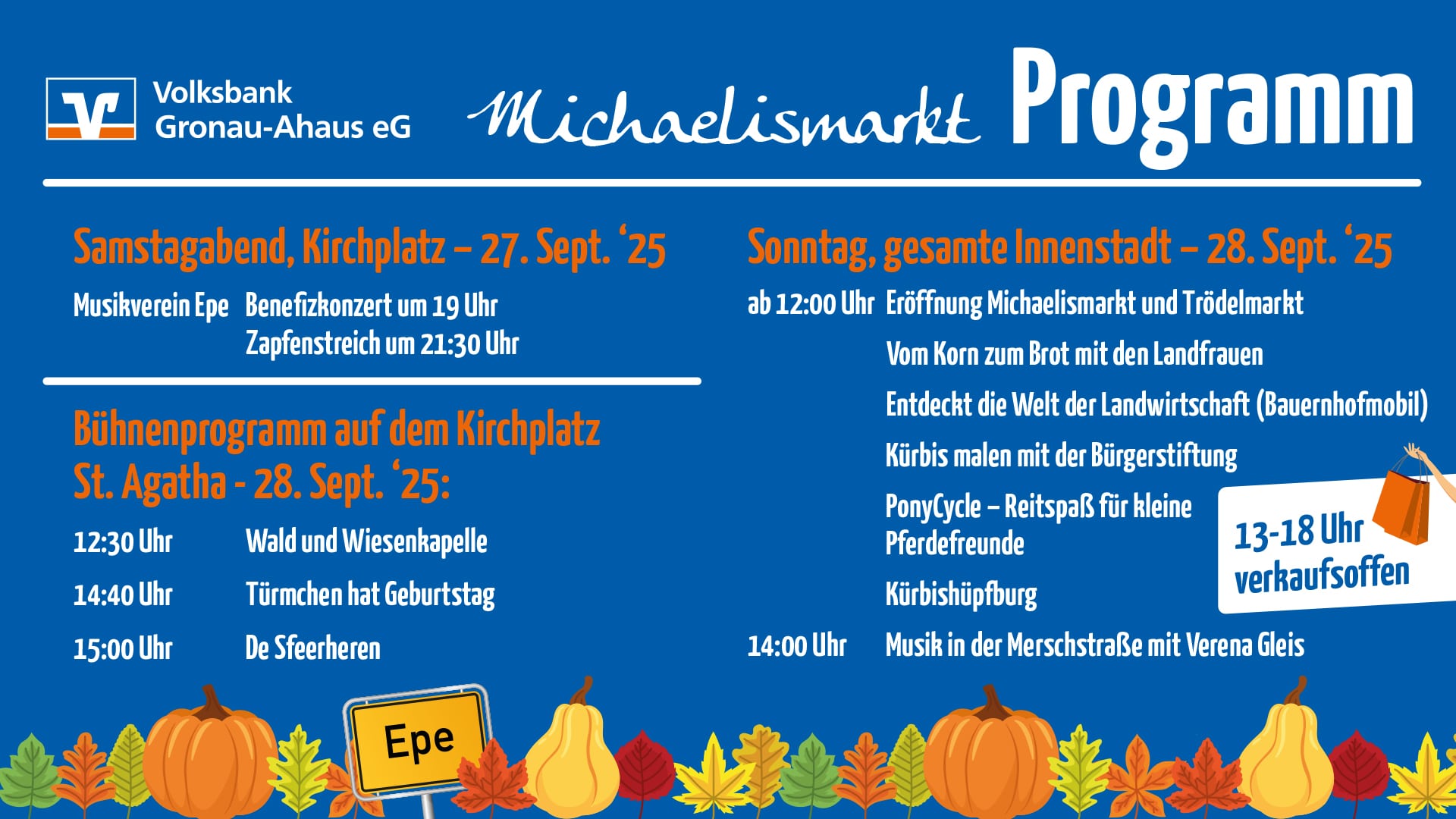 Am 28. September findet in Epe der Michaelismarkt unter dem Motto Land- und Kürbisfest statt! Freut euch auf herbstliches Markttreiben mit regionalen Produkten, bunten Kürbissen und ländlicher Atmosphäre. Passend dazu haben die Geschäfte im Rahmen eines verkaufsoffenen Sonntags von 13 bis 18 Uhr geöffnet und laden zum entspannten Bummeln ein.