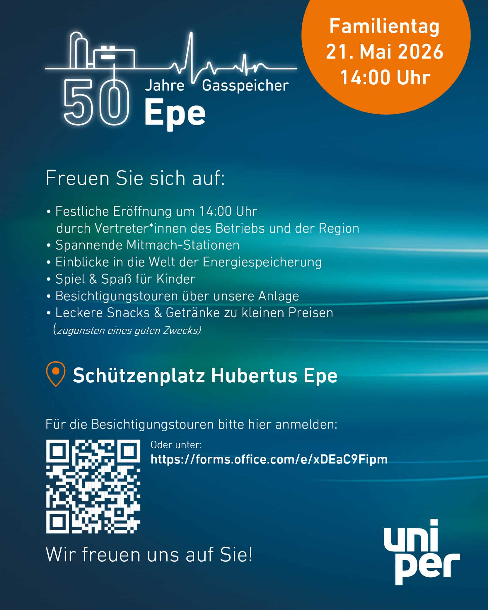 50 Jahre Gasspeicher Epe: Energie sichert – Nachbarschaft verbindet Seit 50 Jahren ist der Gasspeicher Epe Teil der Region. Dieses Jubiläum feiern wir am 21. Mai 2026 mit einem Familientag. Herzlich eingeladen sind Nachbarschaft, Familien und Interessierte zu Einblicken, Begegnungen und Mitmachaktionen auf dem Schützenplatz Hubertus sowie zu Besichtigungstouren über die Speicheranlage - für Groß […]