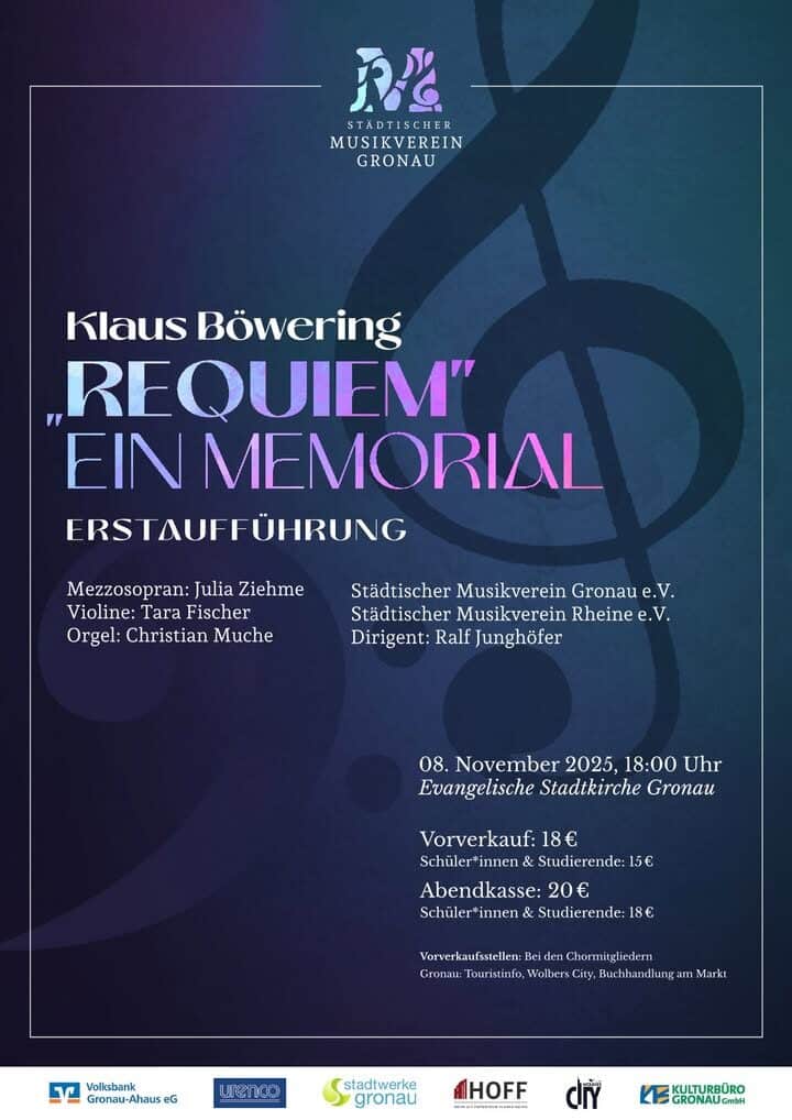 Tickets für das Konzert „Requiem“ – Ein Memorial vom Städtischen Musikverein Gronau e.V. am 8. November in der Ev. Stadtkirche, gibt es ab sofort bei uns in der Touristinfo zu