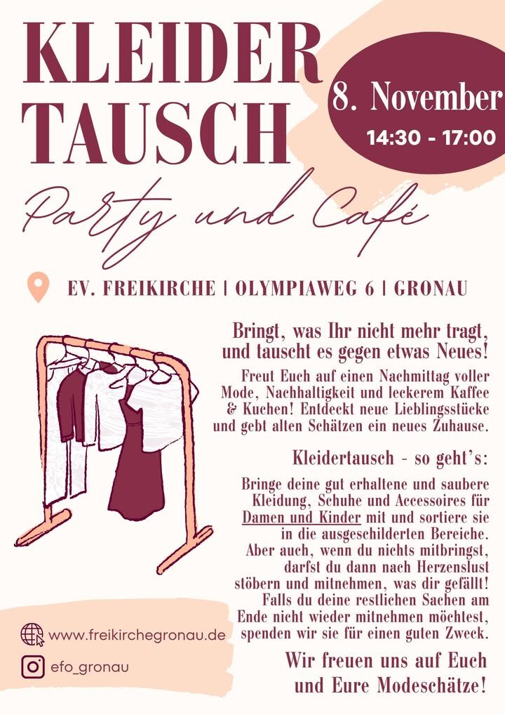 Herzliche Einladung zur 2. KleiderTauschParty mit Café! Bringt, was ihr nicht mehr tragt, und tauscht es gegen etwas Neues! Freut euch auf einen Nachmittag voller Mode, Nachhaltigkeit und leckerem Kaffee