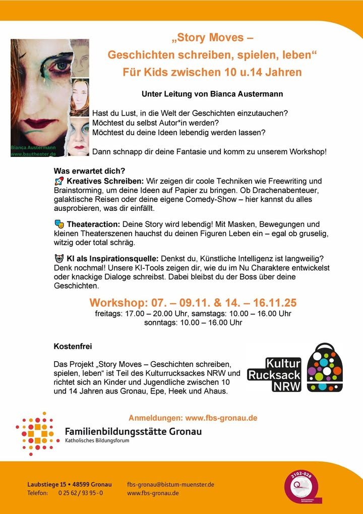 Werde Geschichtenerzähler!! Tauche ein in die Welt der Fantasie, schreibe, spiele und erwecke deine eigenen Figuren zum Leben – im kostenlosen Workshop „Story Moves“ für Kids von 10–14 Jahren! ✍️✨