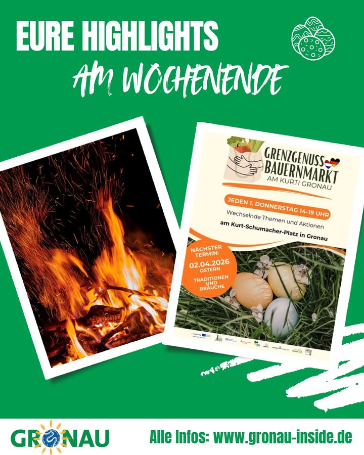 Wir starten mit unseren Wochenendtipps ins lange Osterwochenende! 🐰🥚 Kommt heute zum GrenzGenuss Bauernmarkt & deckt euch mit frischen Produkten & Geschenken zu Ostern ein. Auch in den nächsten Tagen