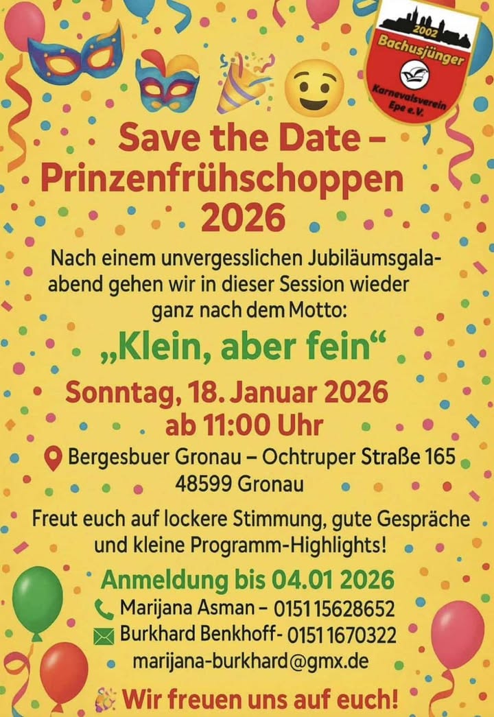 The Bachusjünger invite you to the Prinzenfrühschoppen 🥳 When. Next Sunday from 11 a.m. at Bergesbuer – Gronau. Registrations are still possible. ☺️