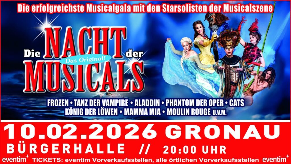 Tickets are available from the Gronau tourist information office or online athttps://www.eventim.de/artist/die-nacht-der-musicals/