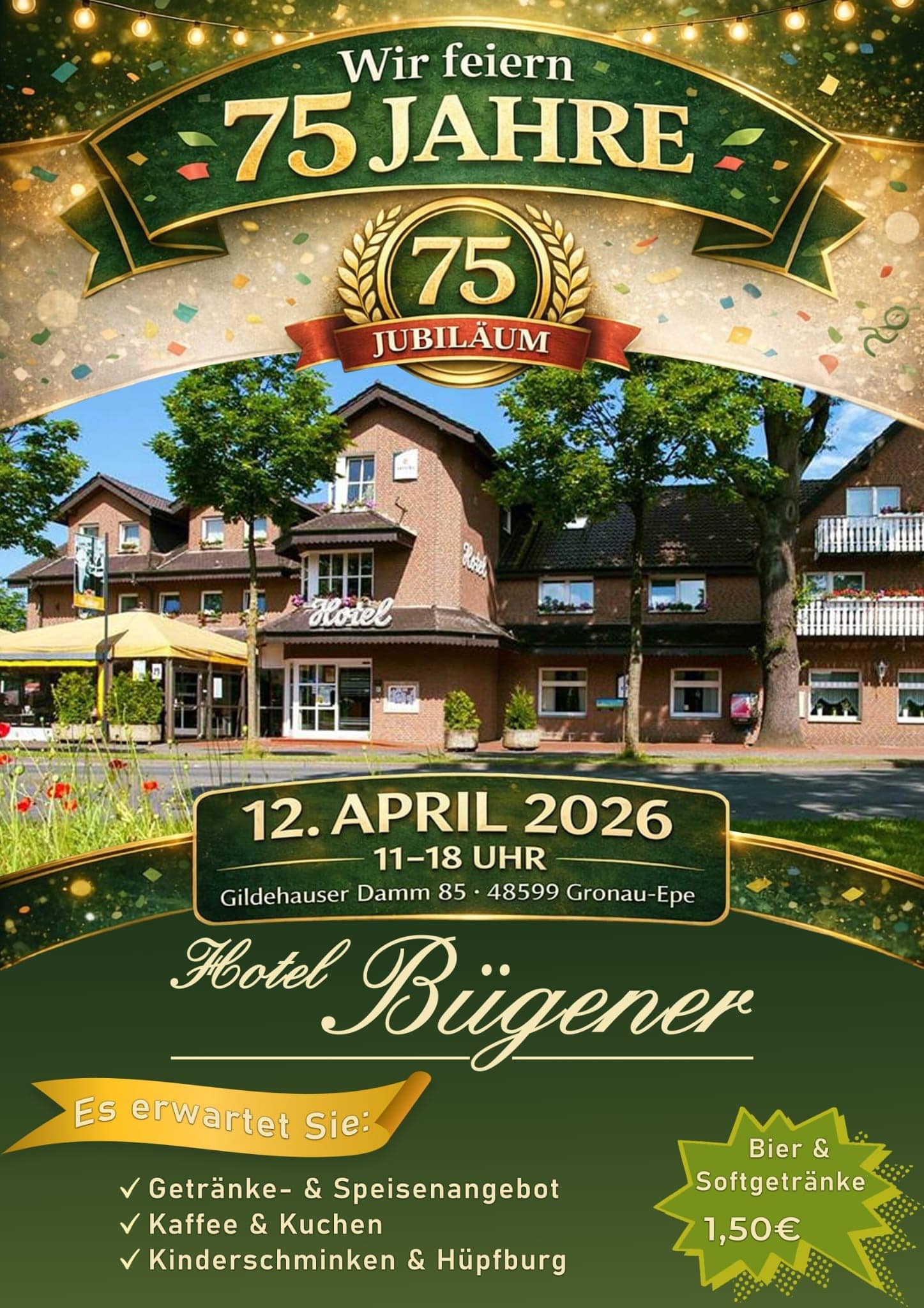 The Hotel BĂ¼gener celebrates its 75th anniversary You can expect: - food & drink - coffee & cake - face painting & bouncy castle