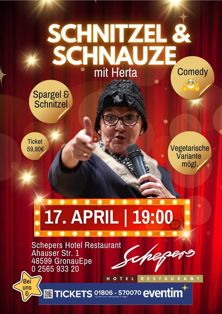 Tickets ab 66 € gibt’s bei uns in der Touristinfo oder online über Eventim: https://www.eventim.de/event/schnitzel-und-schnauze-comedy-mit-herta-schepers-hotel-restaurant-21237894/?srsltid=AfmBOopST0-swiR00Nf0UKRSnO8HLX79iVApQmKDh2CY5OkuWBusQqhk