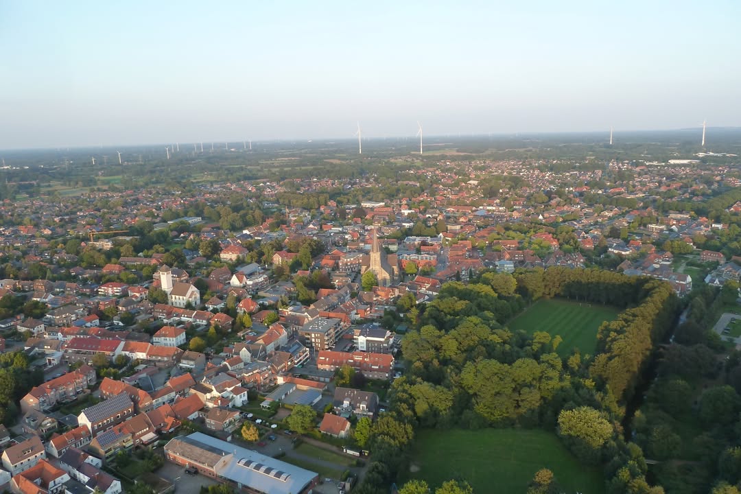 Gronau van bovenaf – heel indrukwekkend en zo groen! ๐๐ Wie kan de watertoren van Gronau en de St Agatha’s kerk zien?
