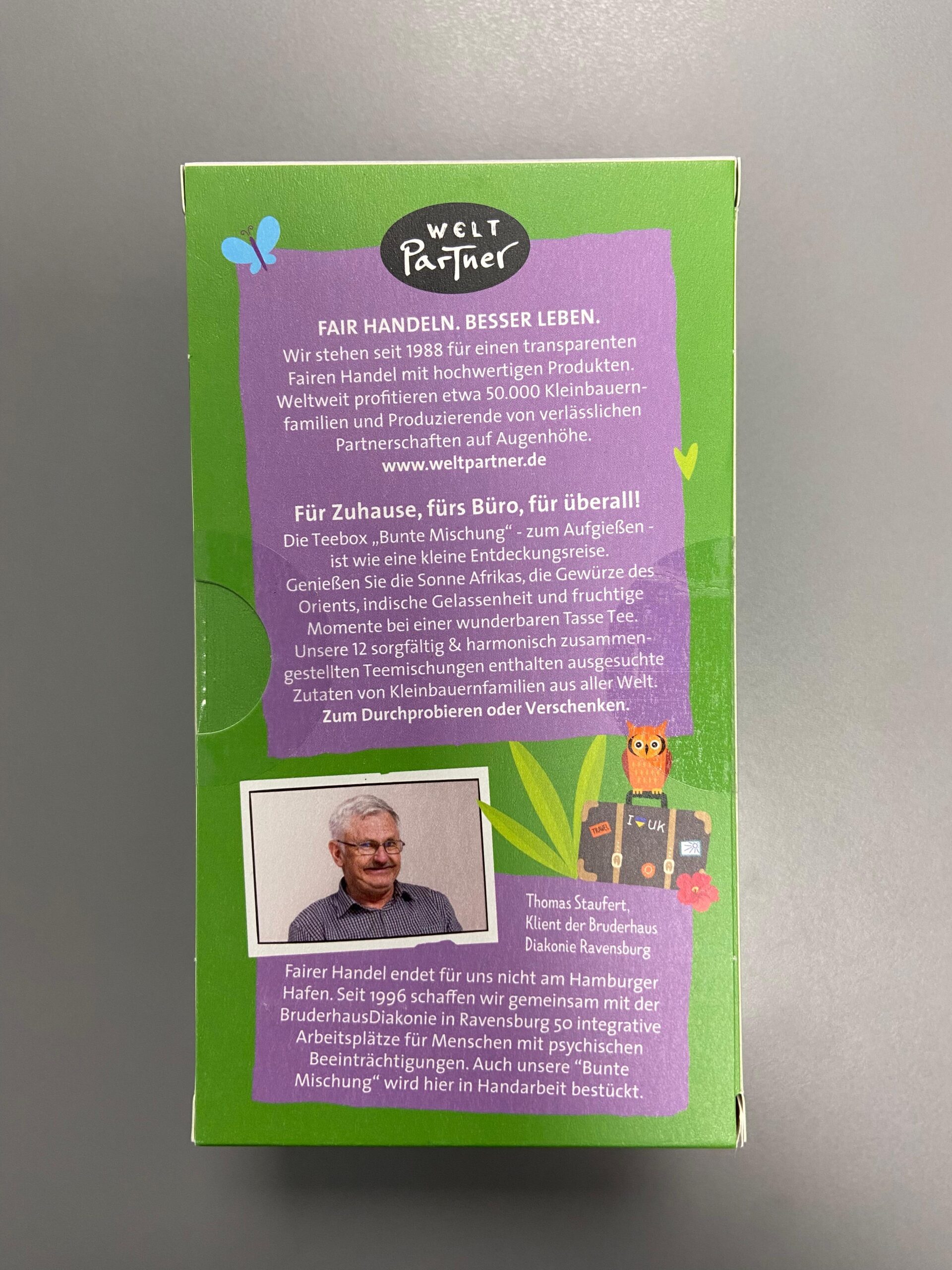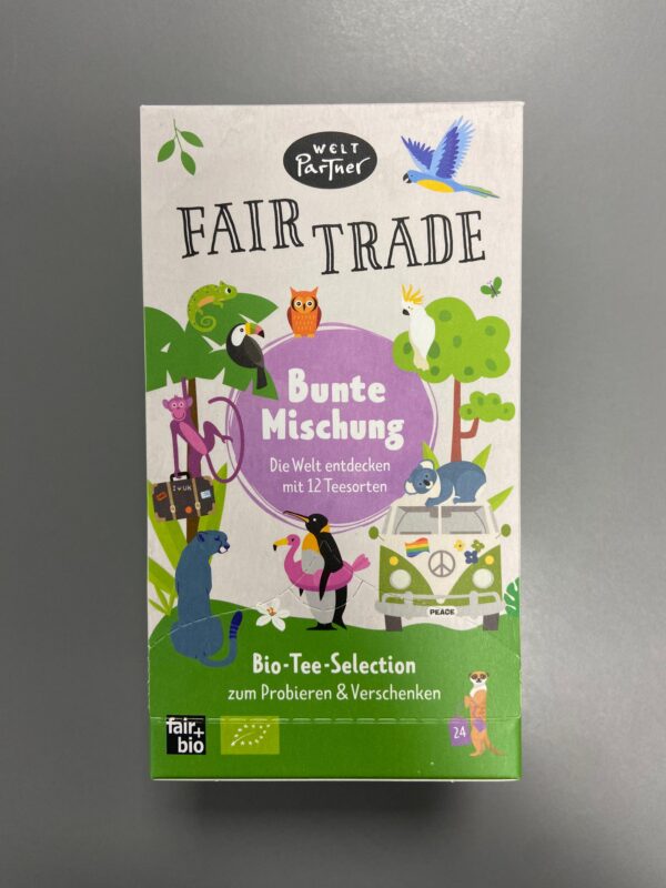 Entdeckt die Welt mit den 12 unterschiedlichen Teesorten in der „Bunten Mischung“. Der Fairtrade Bio-Tee ist perfekt, um alle Sorten zu probieren oder zum Verschenken.
