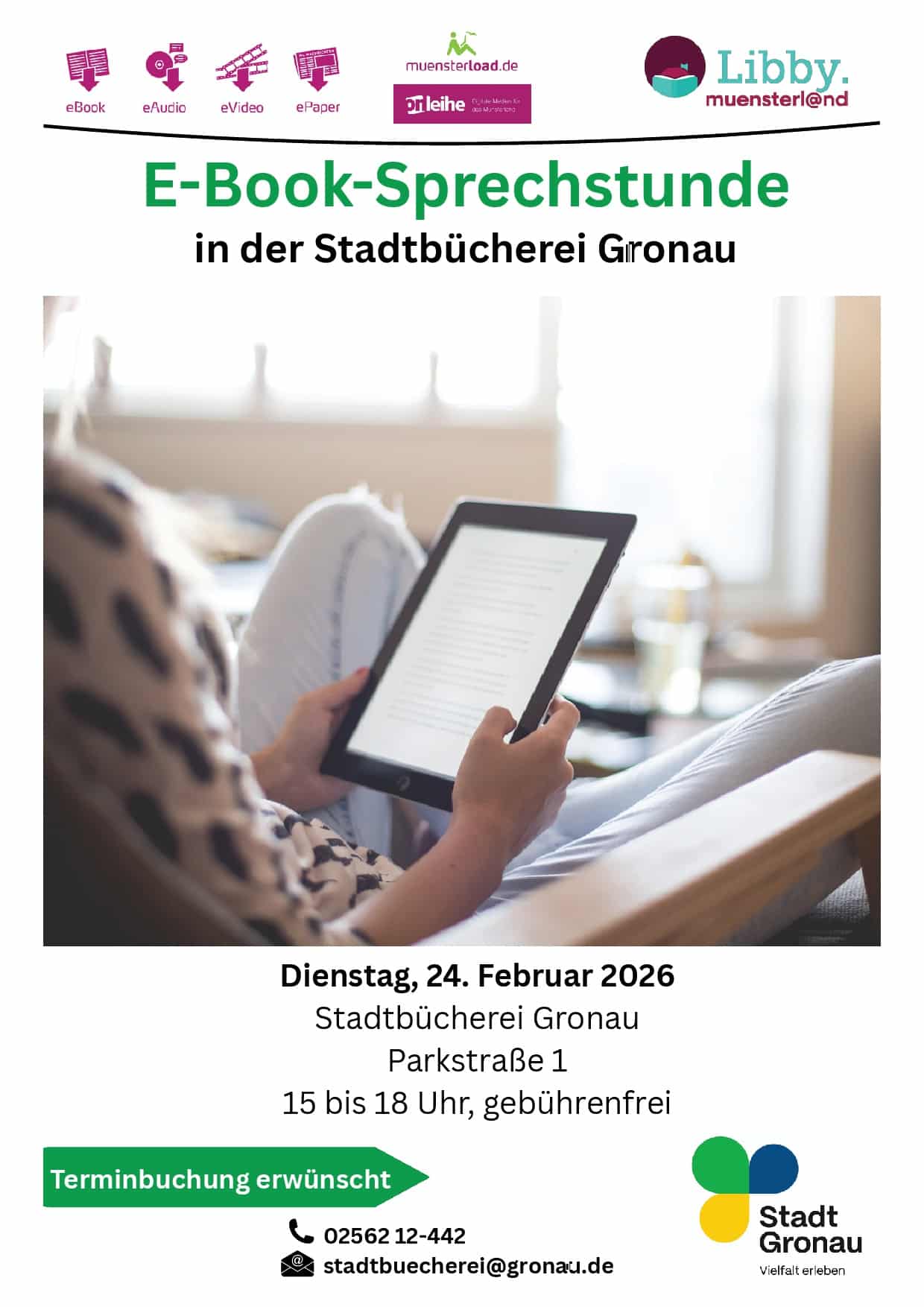 E-Books sind aus der modernen Lesewelt nicht mehr wegzudenken. Sie sind praktisch, platzsparend und bieten Zugang zu einer riesigen Auswahl an Büchern. Doch manchmal gibt es kleine Hindernisse: Ihr E-Book-Reader funktioniert nicht wie gewohnt, ein Update will nicht gelingen, oder es tauchen Fragen zu Lizenzen auf? Solche Herausforderungen können den Lesegenuss schnell trüben. Genau hier setzt unsere E-Book-Sprechstunde an! In einem persönlichen Gespräch bieten wir Ihnen individuelle Unterstützung an und helfen Ihnen, alle technischen Hürden zu überwinden. Ob es um die Bedienung Ihres E-Book-Readers geht, um Fragen zu muensterload.de oder zur englischsprachigen Literatur-Plattform Libby: wir stehen Ihnen mit Rat und Tat zur Seite. Bringen Sie einfach Ihren E-Book-Reader mit und testen vor Ort, ob alles wieder einwandfrei funktioniert. Wir nehmen uns Zeit für Ihre Fragen und sorgen dafür, dass Sie Ihr digitales Leseerlebnis in vollen Zügen genießen können. Wir freuen uns darauf, Ihnen zu helfen und Ihr digitales Lesen noch einfacher und angenehmer zu gestalten!