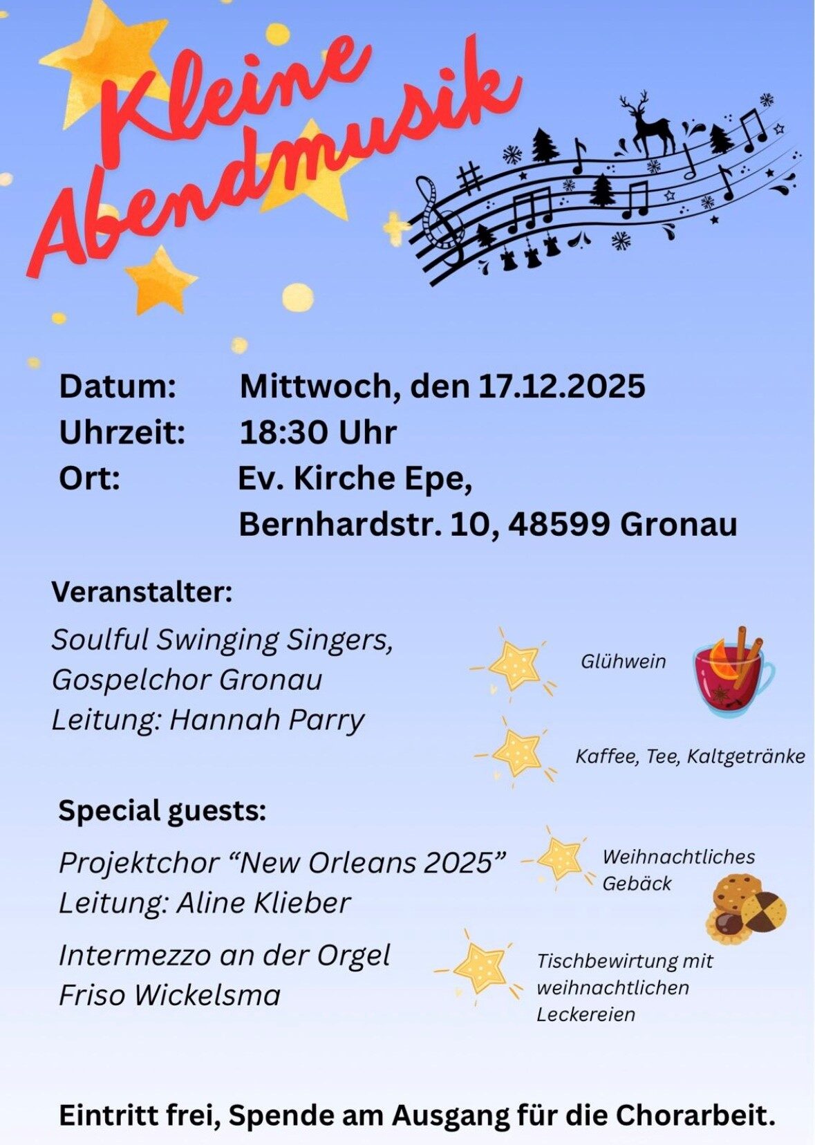 Ausstellungsdauer 23.11. – 14.12.2025 Öffnungszeiten: Freitags, 28.11., 5.12., 12.12.2025: 9 - 12 Uhr (zur Marktzeit in Epe) Sonntag, 30.11.2025: 15 - 17 Uhr Konzert mit Kaffee vom Haus Lebenstein Samstag, 13.12.2025: 17 - 19 Uhr Weihnachtskonzert mit BellaDonna Sonntag, 14.12.2025: 11 - 13 Uhr Führung mit Ricardo Fuhrmann Sonntag, 29.11.2025, 15:30 - 17 Uhr